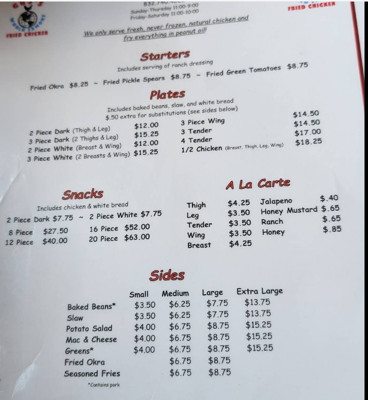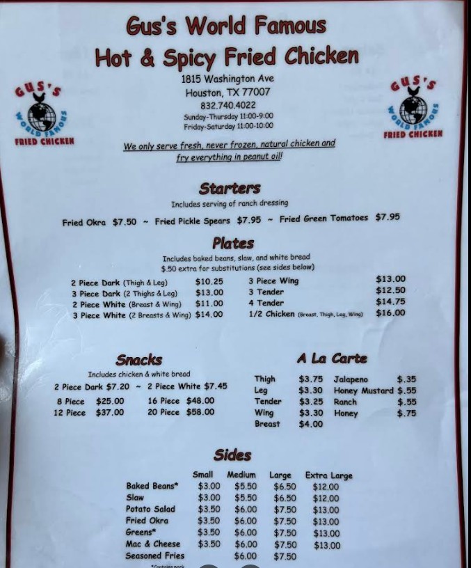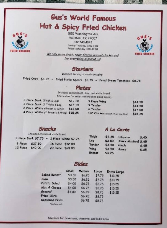 I stopped by Gus’s World Famous Fried Chicken for lunch on a cold January day, and it hit the spot. The restaurant is small and unpretentious—around 20 tables with a handful of bar seats—but clean and welcoming, including spotless bathrooms. There was a steady stream of takeout orders and about six tables filled when we arrived, giving it a lively but comfortable feel. Our server, Sonny K., was fantastic—quiet, friendly, and genuinely funny, always smiling and attentive without hovering. I ordered the three-piece white meat plate with baked beans, coleslaw, and a side of fries. My wife went with the four-piece chicken wings paired with okra and coleslaw. Every bite was hot, fresh, and full of flavor. They serve beer, but not an overcomplicated selection—32 oz tallboys of Bud, Bud Light, and an old-school malt liquor that feels just as classic as the chicken recipe itself. The portions were generous, and while we thought we might have ordered too much, the food was so good that nothing was left by the time we finished. A nice final touch: Sonny packed us a to-go cup for our beverages, which was much appreciated. They’ve also started serving catfish, which we didn’t try this time—but that just gives us another reason to come back. Great food, fair prices, and excellent service. We’ll definitely be returning.