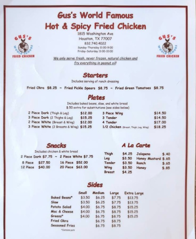 Gus's World Famous Fried Chicken is open on Monday, Tuesday, Wednesday, Thursday and Sunday from 11:00 AM - 9:00 PM; Friday and Saturday from 11:00 AM - 10:00 PM.